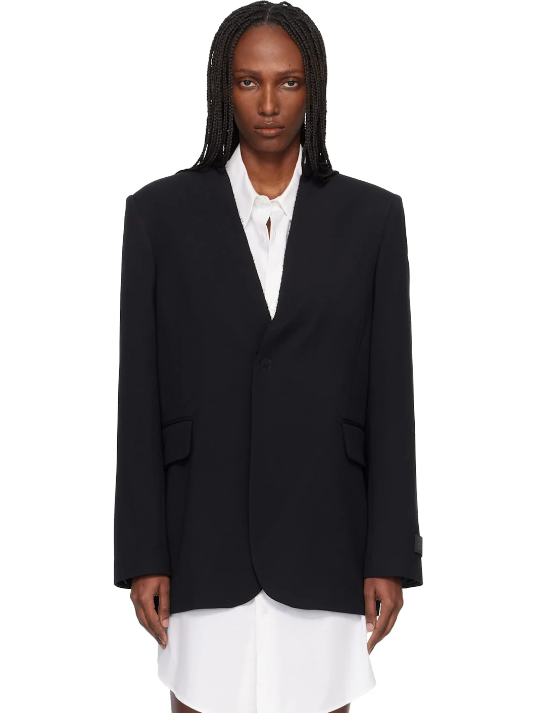 Stretch virgin wool-blend twill blazer. · Raw edge at V-neck · Button closure · Flap pockets at front · Padded shoulders · Logo patch at cuff · White stitching at back collar · Central vent at back hem · Welt pocket at interior · Full satin lining Supplier color: Black Body: 54% polyester, 44% virgin wool, 2% elastane. Lining: 100% viscose. Made in Portugal 261188F057006
