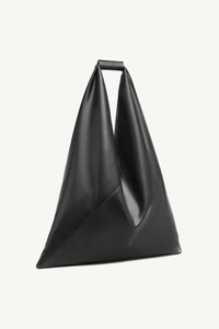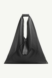 First introduced as part of the Autumn-Winter 2009 collection, the Japanese bag has since become MM6’s most emblematic accessory. Crafted from black PU leather, the bag features buttons at its edges that allow it to change form through folding, just like the origami that inspired its silhouette. The brand’s discreet yet distinct signature, a horizontal line of white stitches, is found on the back. Product Details Item ID S54WD0039P6444T8013 Body: 60% polyester, 40% polyurethane Contrast: 100% calf leather Lining: 100% polyester Medium handbag in PU leather MM6 numeric signature leather cuff Two snap buttons at the edge to change the shape White stitch line at the back Button closure on leather detail MM6 numeric signature jaquard lining Inside pocket with button closure Height: 55 cm/21,6 in Width: 2 cm/0,8 in Length: 50 cm/20 in Handle drop: 20 cm/7,8 in Clean with a gentle cleanser and a damp microfiber cloth