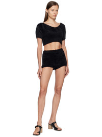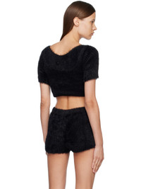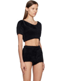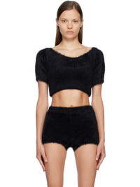 Shag knit nylon sweater. · Off-the-shoulder construction · Garter-style straps at hem for alternate styling · White stitching at back Supplier color: Black