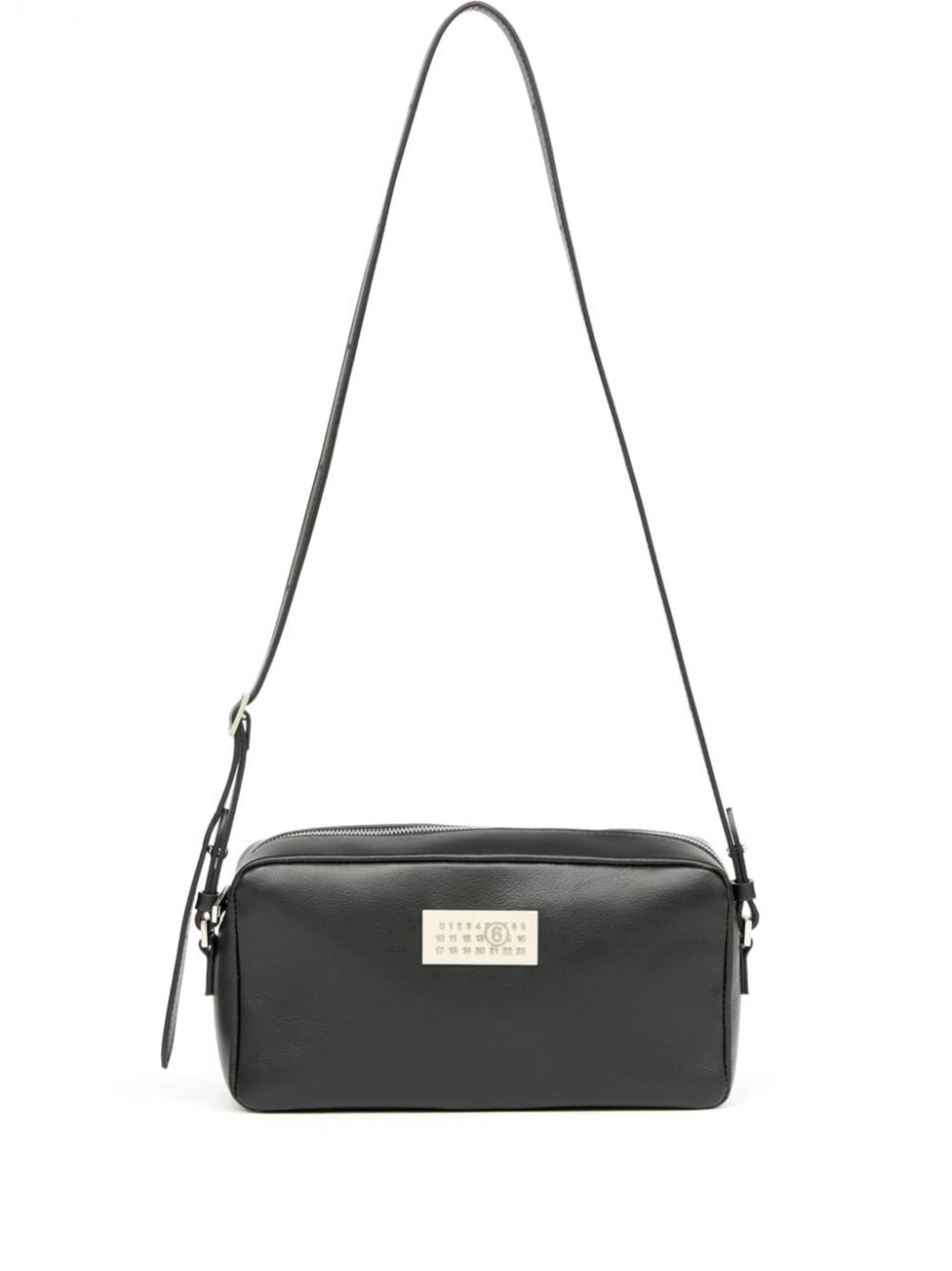 black calf leather contrast stitching signature numbers motif adjustable shoulder strap top zip fastening silver-tone hardware Size & Fit Model Measurements: Bust: 0cm Height: 0cm Hips: 0cm Waist: 0cm Fabric and Care Designer Style ID: SB6WG0014P7182 Designer Colour: T8013 BLACK Composition: Outer: Calf leather 100%Made in Italy