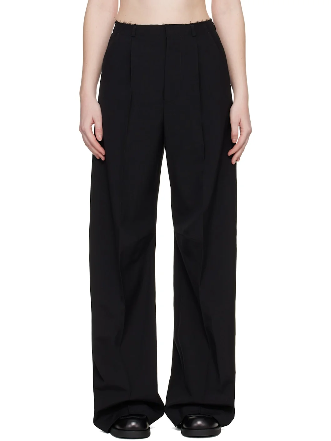 Virgin-wool blend canvas trousers. · Wide-leg · High-rise · Raw-edge at waistband · Belt loops · Four-pocket styling · Zip fly · Central crease at front and back legs · Dart at knees · Seam at back knees · White stitching at back waist Supplier color: Black Body: 55% polyester, 45% virgin wool. Pocket lining: 100% viscose. Made in Italy 261188F087009