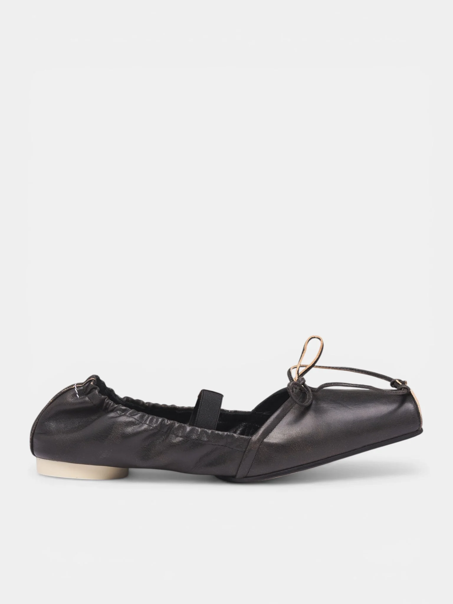 Ballet flats in black with leather construction defined by a square toe and elasticated strap. Featuring: • Low profile • Square toe • Elasticated opening with strap fastening • Self-tie bow at vamp • White stitch line at back • Made in Italy • Upper: 100% Calf Leather | Contrast: 100% Rubber | Lining: 100% Calf Leather | Inside: 100% Calf Leather | Sole: 100% Calf Leather • Italian sizing