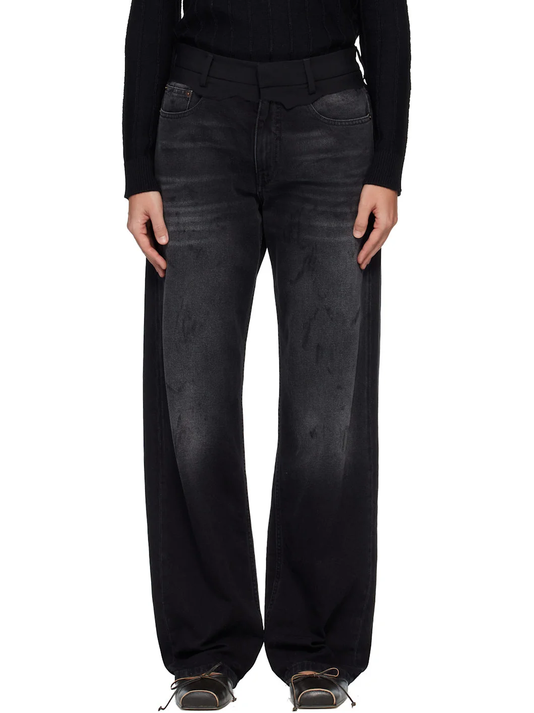 Non-stretch denim jeans. · Fading and stains throughout · Wool-twill waistband with raw edge · Belt loops · Five-pocket styling · White stitching at back waist · Logo patch at back pocket Supplier color: Black Body: 100% cotton. Made in Romania 261188F069002