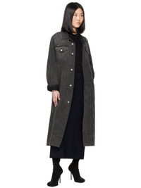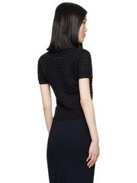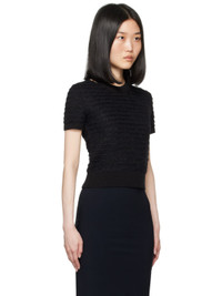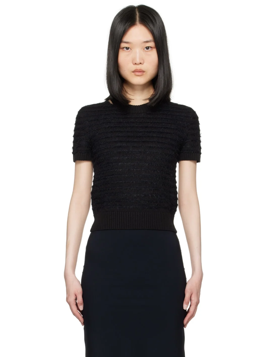 Knit and shag knit acrylic- and virgin wool-blend sweater. Intarsia stripes throughout. · Rib knit crewneck, hem, and cuffs · Cutout at crewneck · White stitching at back collar Supplier color: Black/Black 44% acrylic, 44% virgin wool, 12% polyamide. Made in Romania 242188F110007