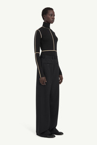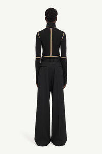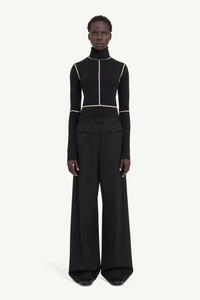 Two halves, one whole. These trousers reconstruct the familiar by merging two backs into a single garment, challenging the conventions of tailoring. Their exaggerated proportions amplify volume, while welt pockets sit where front-facing details would traditionally be. At the back, they are signed with the MM6 white stitch line. Product Details Item ID S52KA0538S47848900 Primary Fabric: 54% Polyester 44% Virgin Wool 2% Elastane-Spandex Pocket Lining: 100% Viscose-Rayon Tailored trousers in wool blend Inverted construction with belt loops Buttoned welt pockets at the front Side zip closure Extra-long wide-leg silhouette White stitch line at the back Made in Italy Model is 180 cm tall and wears a size 42.