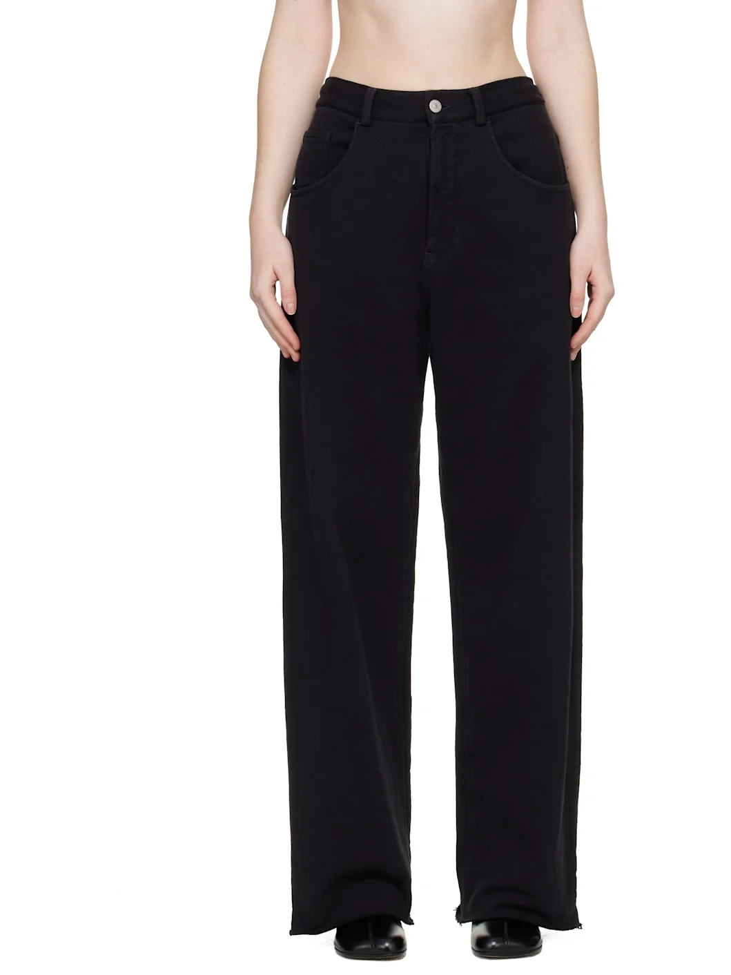 Cotton french terry trousers. · Wide-leg · Mid-rise · Concealed drawstring at waistband · Belt loops · Five-pocket styling · Zip fly · Raw edge at hem · White stitching at back waist Supplier color: Black 100% cotton. Made in Italy 261188F086009