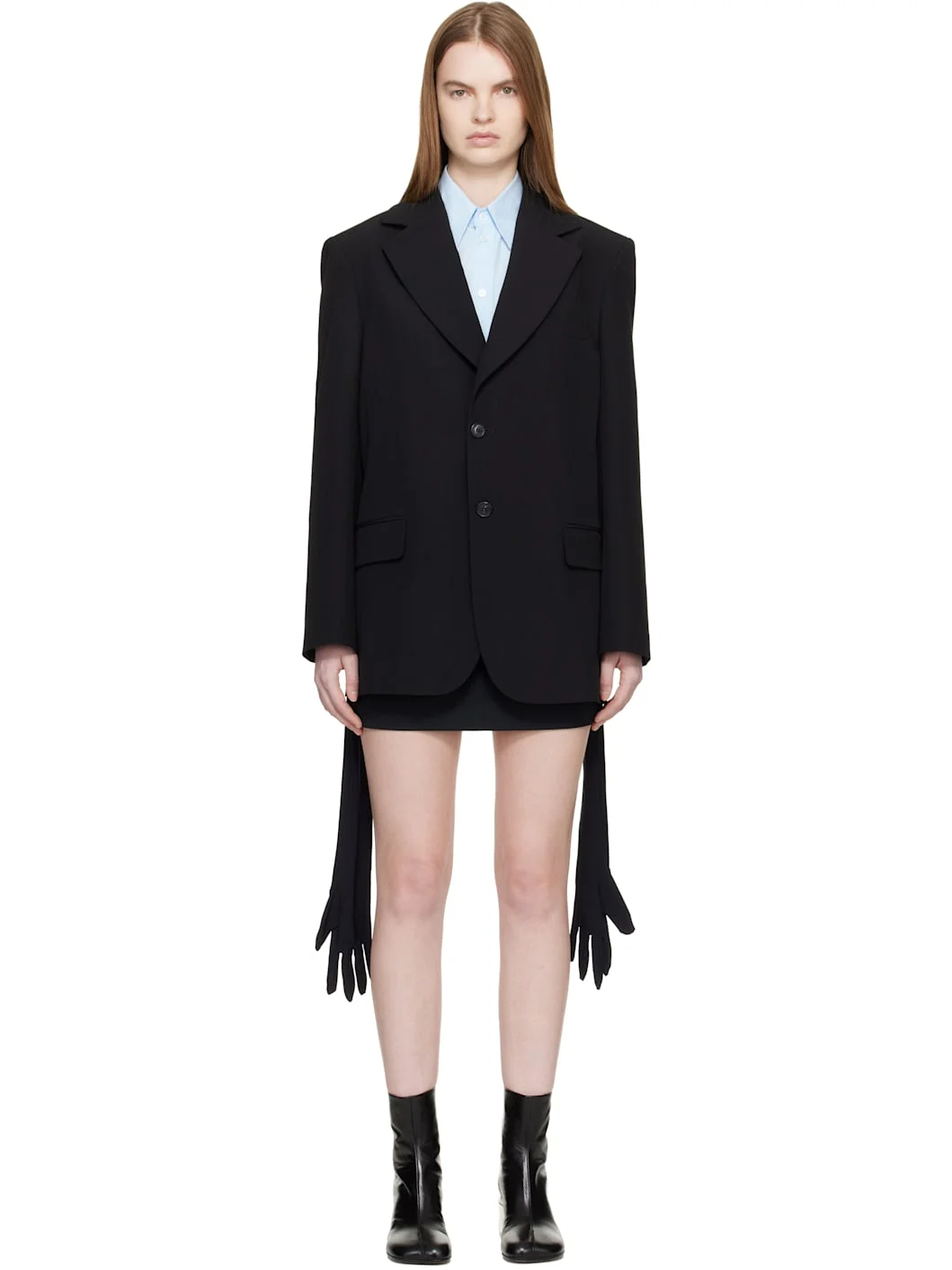 Virgin-wool blend canvas blazer. · Notched lapel · Button closure · Welt pocket at chest · Darts at front · Belt loops and flap pockets at waist · Mock gloved sleeves at waist · Padded shoulders · Surgeon's cuffs · White stitching at back collar · Welt pocket at interior · Satin twill lining Supplier color: Black Body: 55% polyester, 45% virgin wool. Lining: 100% viscose. Made in Italy 261188F057001