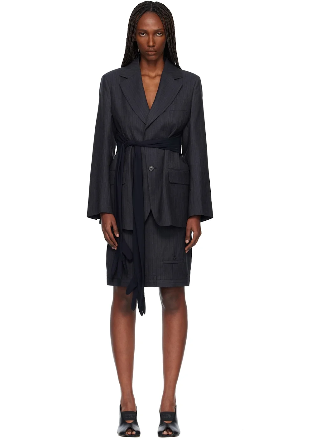 Wool-blend twill blazer. · Integrated gloves function as alternate sleeves · Pinstripes throughout · Notched lapel · Button closure · Welt pocket at chest · Flap pockets at front · Padded shoulders · Buttoned surgeon's cuffs · White stitching at back collar · Welt pocket at interior · Full viscose satin lining Supplier color: Black Body: 60% virgin wool, 40% cotton. Lining: 100% viscose. Made in Italy 261188F057000
