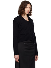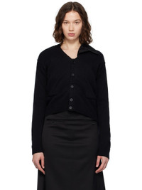 Knit wool cardigan. · Layered construction · Y-neck · Button closure · Rib-knit crewneck at front · Rib-knit hem and cuffs · White stitching at back collar Supplier color: Black 100% wool. Made in Romania 252188F095007