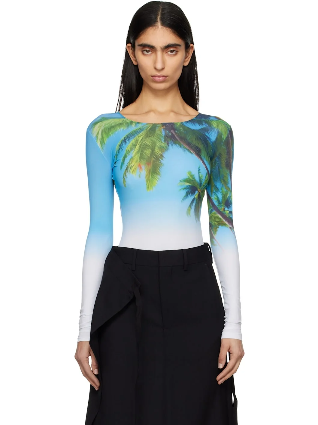 Stretch nylon jersey bodysuit. Graphic pattern printed throughout. · Crewneck · Logo flag at side seam · Press-stud fastening at bottom · White stitching at back collar Supplier color: Blue/White/Green 73% polyamide, 27% elastane. Made in Italy 251188F358002