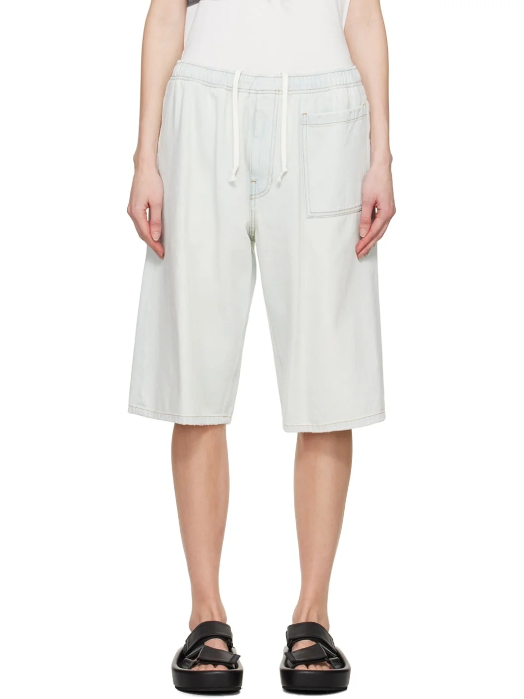 Non-stretch denim shorts. Fading throughout. · Concealed drawstring at elasticized waistband · Four-pocket styling · Zip-fly · Subtle distressing at cuffs · White stitching at back · Contrast stitching in tan Supplier color: Light blue Body: 100% cotton. Lining: 65% polyester, 35% cotton. Made in Italy 241188F088008