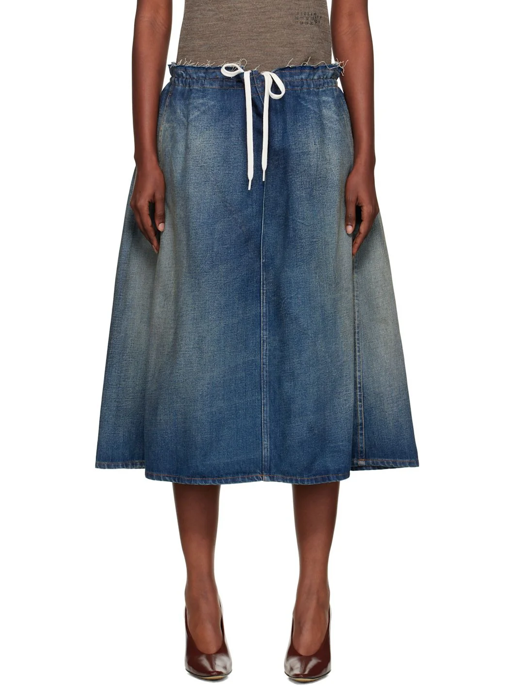 Non-stretch denim midi skirt. · Fading throughout · Raw edge and concealed drawstring at elasticized waistband · Two-pocket styling · White stitching at back · Contrast stitching in tan Supplier color: Medium blue Body: 100% cotton. Trim: 65% polyester, 35% cotton. Made in Italy 252188F092000