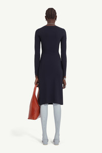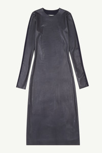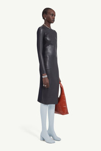 Long dress crafted in coated jersey on the front contrasted with lycra at the back. The snug-fit silhouette has a crew neckline and features a tonal numeric artwork embroidered at the front. The discreet yet distinct signature, a horizontal line of white stitches, is found on the back. Product Details Item ID S52DD0004STJ380961 Fabric 1: 73% polyamide, 27% elastane Fabric 2: 96% polyester 4% elastane Coating: 100% polyurethane Faux leather midi dress Faux stretch leather at the front and lycra at the back Crew-neck MM6 numeric signature at the front White stitch line at the back Shrunken fit Made in Italy Model is 6' tall and wears a size S.