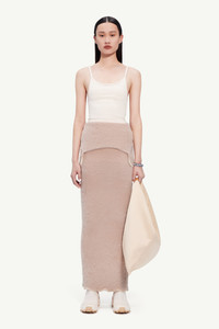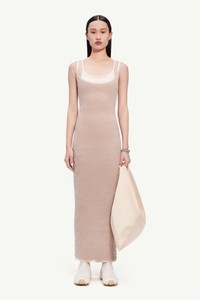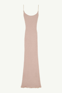 Long spaghetti-strap dress crafted in light furry knit with a ribbed effect. The snug style highlights the body in motion, a central theme of the collection. Frilled and frayed detailing at the hemlines elevate the design.