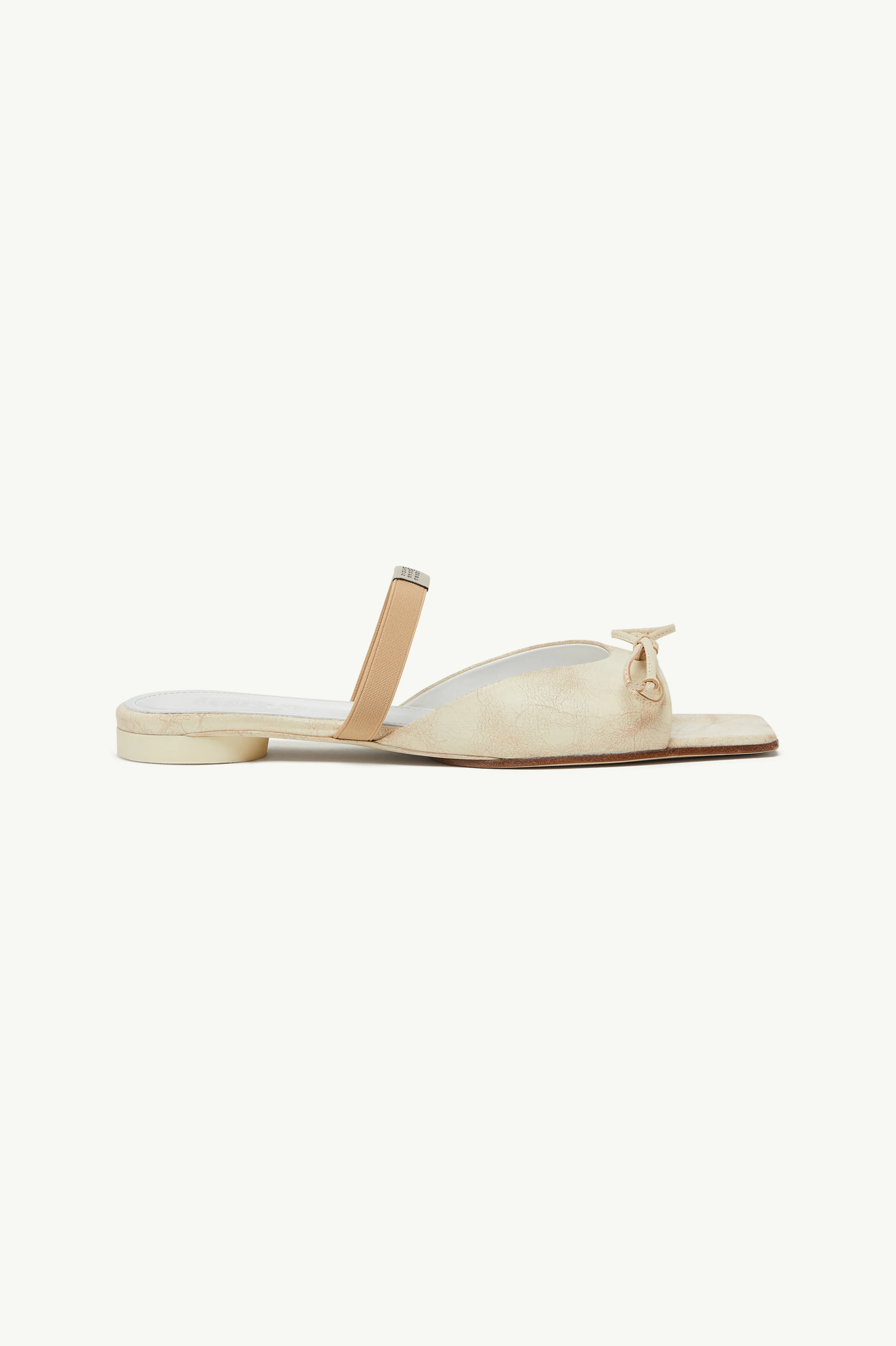 A squared front defines this leather shoe, finished with a slim bow tied across the vamp. A single strap runs across the foot, marked with the MM6 numeric artwork, while the leather surface shows natural variation that gives the design a worn-in feel. Product Details Item ID S66WP0126P7706HB496