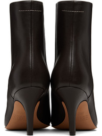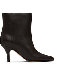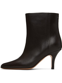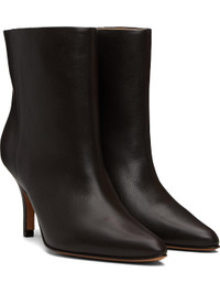 Ankle-high buffed calfskin boots. · Pointed toe · White stitching at heel collar · Buffed goatskin lining · Covered stiletto heel with rubber injection · Calfskin sole · Heel: H3" Supplier color: Mudd Upper: calfskin. Sole: calfskin, rubber. Made in Italy 252188F113003