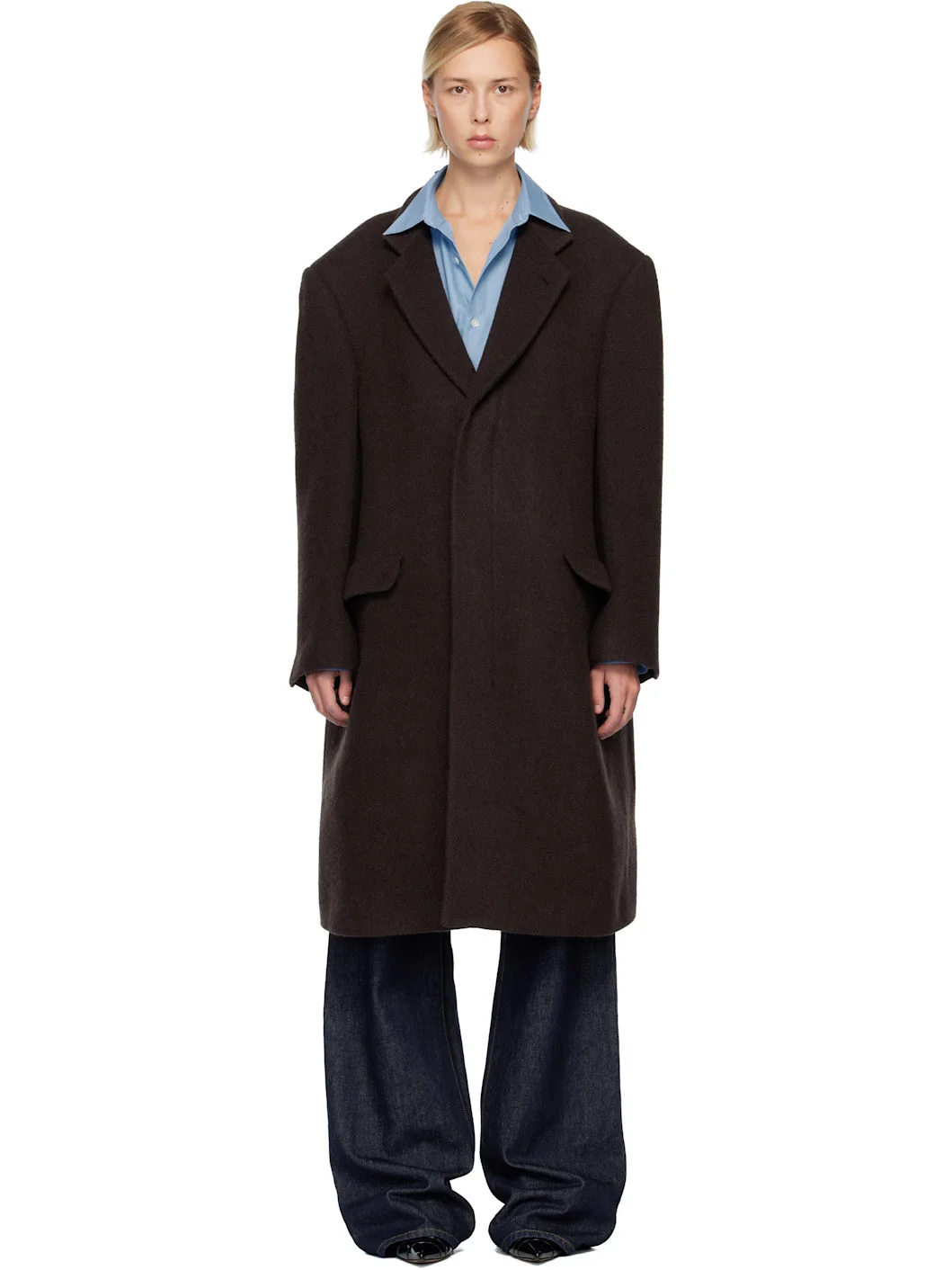 Virgin wool melton coat. · Notched lapel · Button closure · Flap pockets at front · Padded shoulders · Surgeon's cuffs · Draped satin panel at back · Welt pocket at interior · Full satin lining Supplier color: Brown/Black Body: 100% virgin wool. Trim: 100% viscose. Fill: 100% polyester. Lining: 100% viscose. Made in Italy 252188F059012