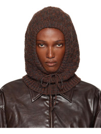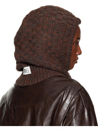 Knit virgin wool-blend hood. · Distressing and check pattern throughout · Drawstring at face · Logo patch at back face Supplier color: Brown 50% virgin wool, 50% acrylic. Made in Romania 252188F014002