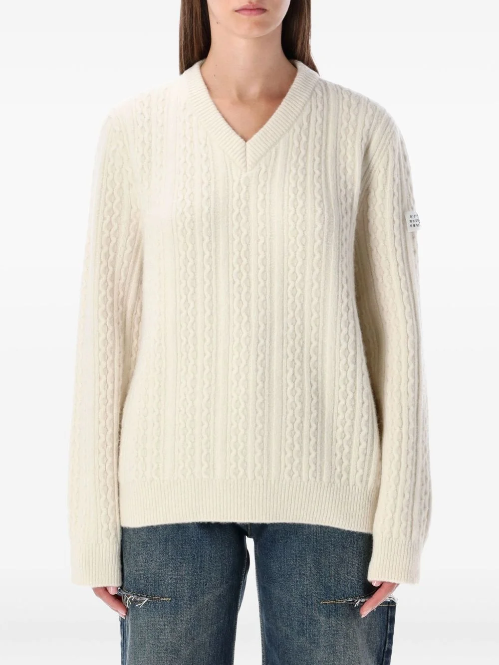 cable-knit V-neck sweater Highlights - Off-white - Cable knit - V-neck - Long sleeves - Straight hem - Logo patch Imported Composition Wool 35%, Acrylic 35%, Polyamide 28%, Spandex/Elastane 2% Washing instructions Read Manufacturer Guidelines