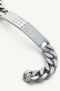 A silver-finished brass chain bracelet partially coated in white paint, introducing a quiet break in its polished surface. Inside, the numeric signature affirms MM6’s attention to detail. It’s a familiar shape, subtly disrupted to remind us that even everyday forms can be rethought. Product Details Item ID SM6UY0049P8339971 Body: 100% Brass Polished Palladio Classic chain bracelet Engraved MM6 numeric signature on the tag Handpainted treatment Made in Italy The item comes in a white zipped bag