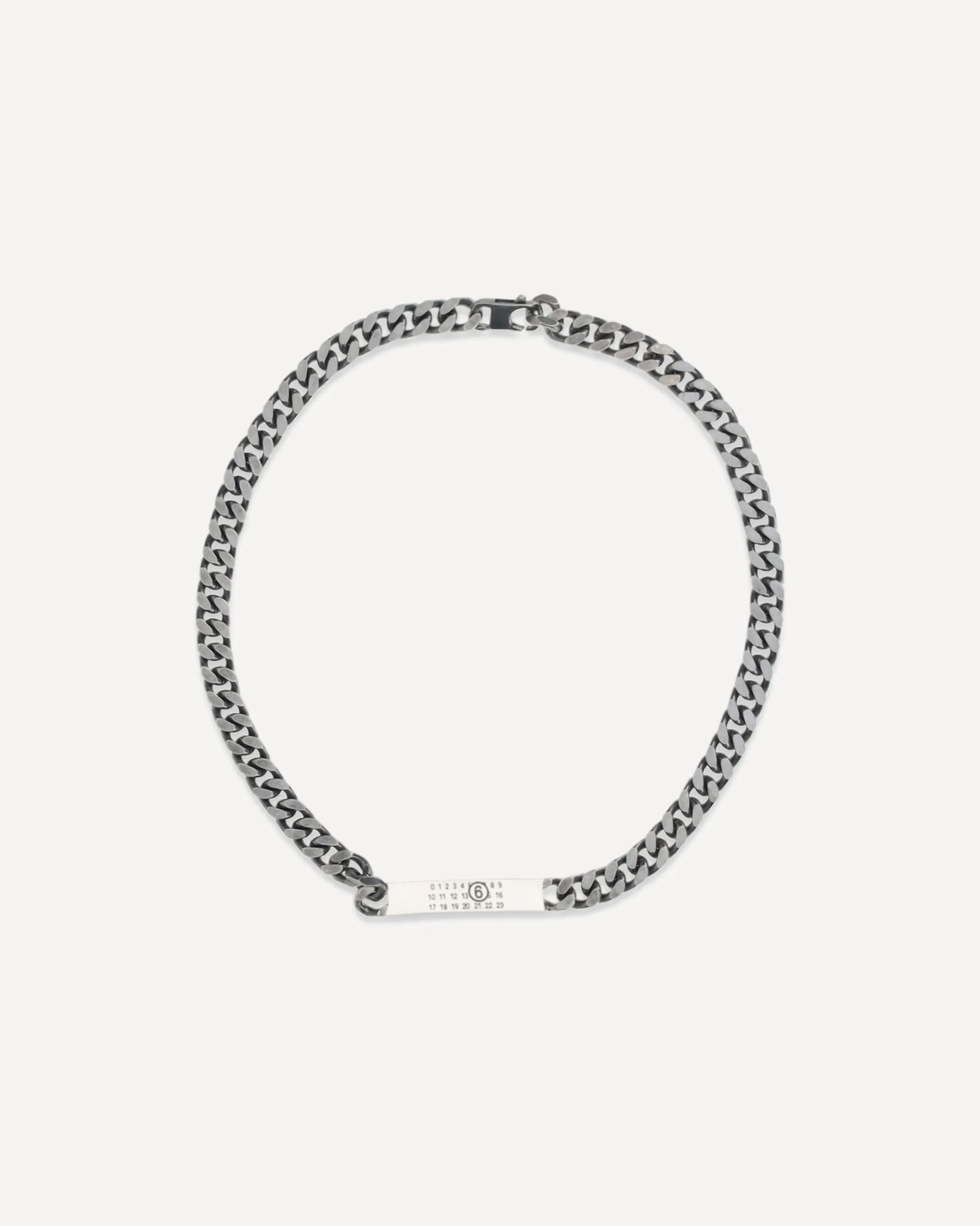 The classic chain Necklace by MM6 is crafted from brass and inspired by Margiela's iconic chain jewelry. The minimalist design is enhanced by the signature number engraved on a small plate, giving the piece a distinctive and recognizable detail. DETAILS - Sku: SM6UU0033SV0235_954 - Season: SS26 - Composition: GENERAL 100% Metal Metallic Metallised - MADE IN ITALY