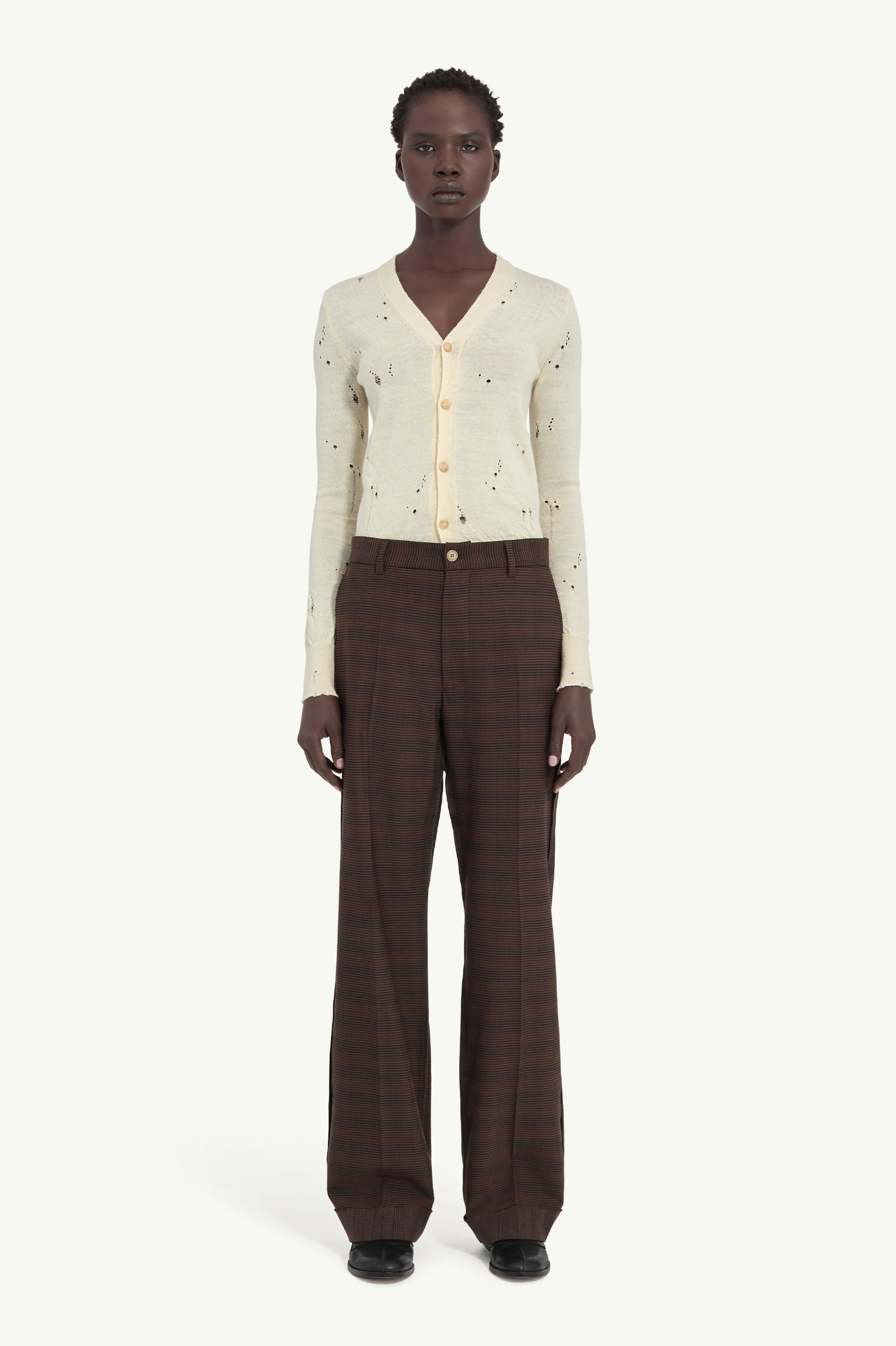 These checked trousers balance heritage tailoring with MM6’s subversive edge. A sharp silhouette is disrupted by unexpected raw-cut trims along the seams, exposing a contrast of tradition and deconstruction. Finished with the white stitch line at the back, it subtly references the Maison’s signature. Product Details Item ID S52KA0536M35475001F Primary fabric: 53% Polyester, 43% Virgin Wool, 4% Elastane-Spandex Pocket lining: 100% Cotton Straight-leg pants with checked pattern Button and zip front closure Straight-leg silhouette Side stripe on outer seams Two front side pockets Single welt pocket at back Turned-up cuffs at hem Belt loops on waistband White stitch line at the back Made in Italy Model is 180 cm tall and wears a size 42.