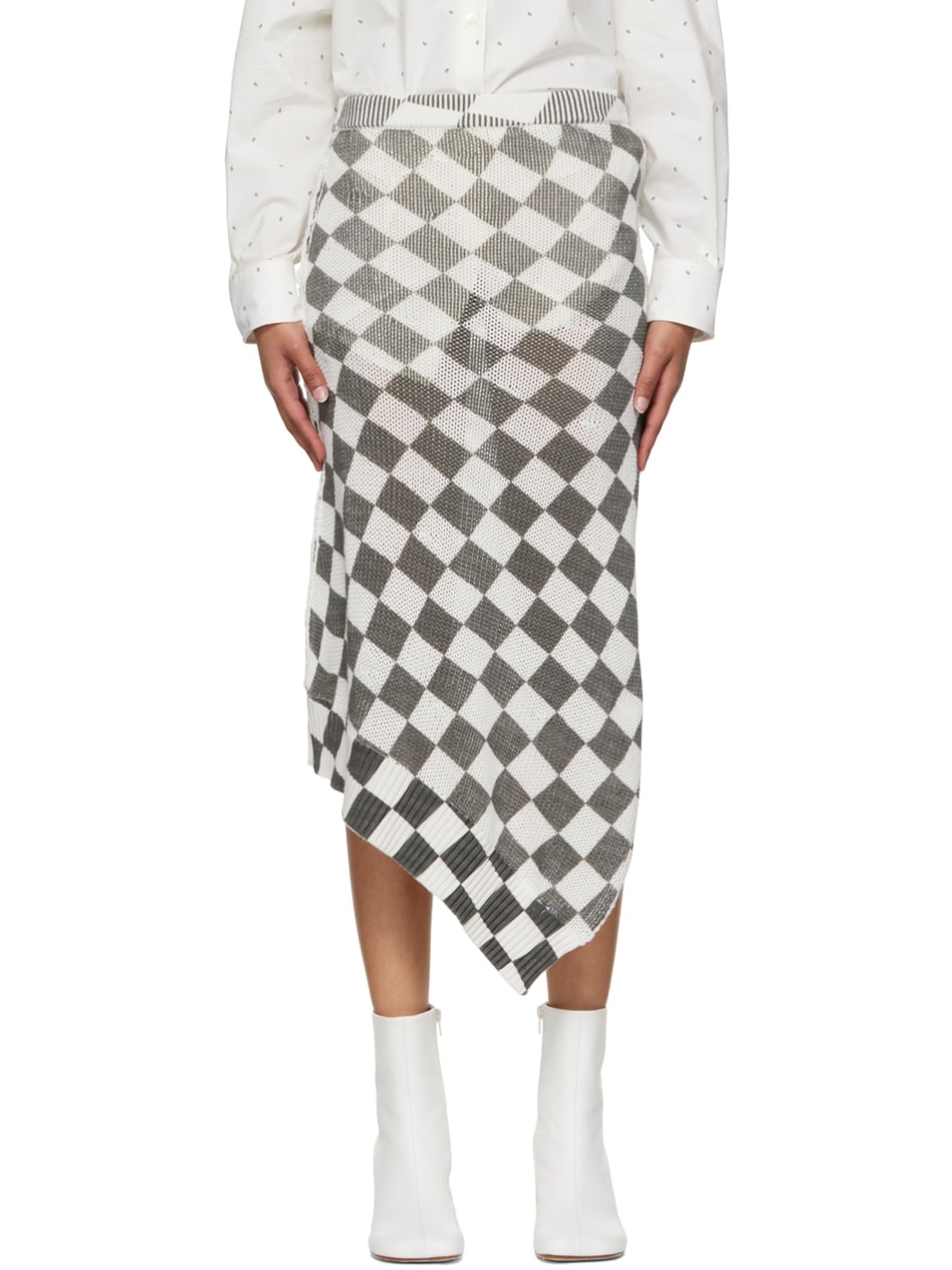 Rib knit cotton skirt. Jacquard argyle pattern throughout. · Concealed drawstring at elasticized waistband · Vented outseams · Asymmetric hem Supplier color: Distorted chess 100% cotton.