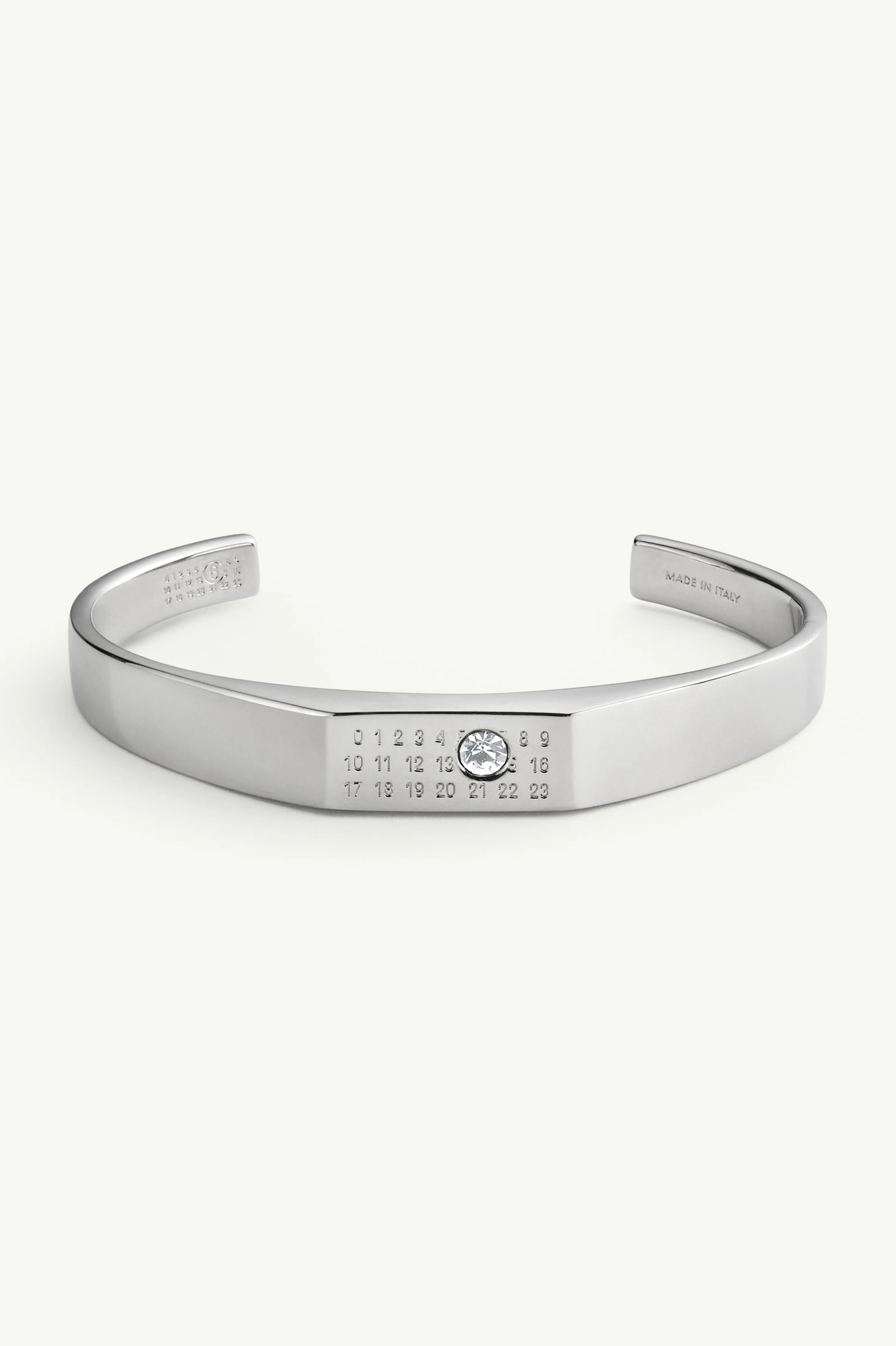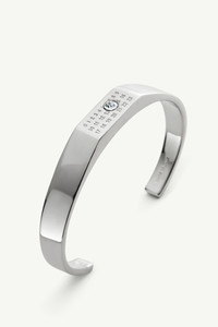 Imagined as an elongated chevalier ring, this open bracelet plays with proportion and reduction. A rhinestone punctuates the engraved numeric logo, substituting the number 6 in a subtle yet subversive gesture. Product Details Item ID SM6UY0104P8859951 Composition: 100% brass One size Brass cuff bracelet with crystal detail Contrast: 100% glass Embossed numerical logo on top Engraved brand logo Avoid salt, chlorine water and aggressive liquid Made in Italy