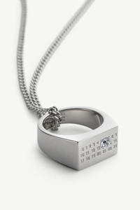 A sculptural take on the chevalier silhouette, this ring is defined by its clean lines and polished surface. The MM6 numeric logo is engraved on the face, with the number 6 replaced by a rhinestone, introducing an elegant disruption to the Maison's signature. Product Details Item ID SM6UU0094P8859951 Body: 100% brass Contrast: 100% glass One size Brass necklace with ring-shaped pendant Calendar engraving with glass detail on pendant Engraved brand logo Avoid salt, chlorine water and aggressive liquid Made in Italy