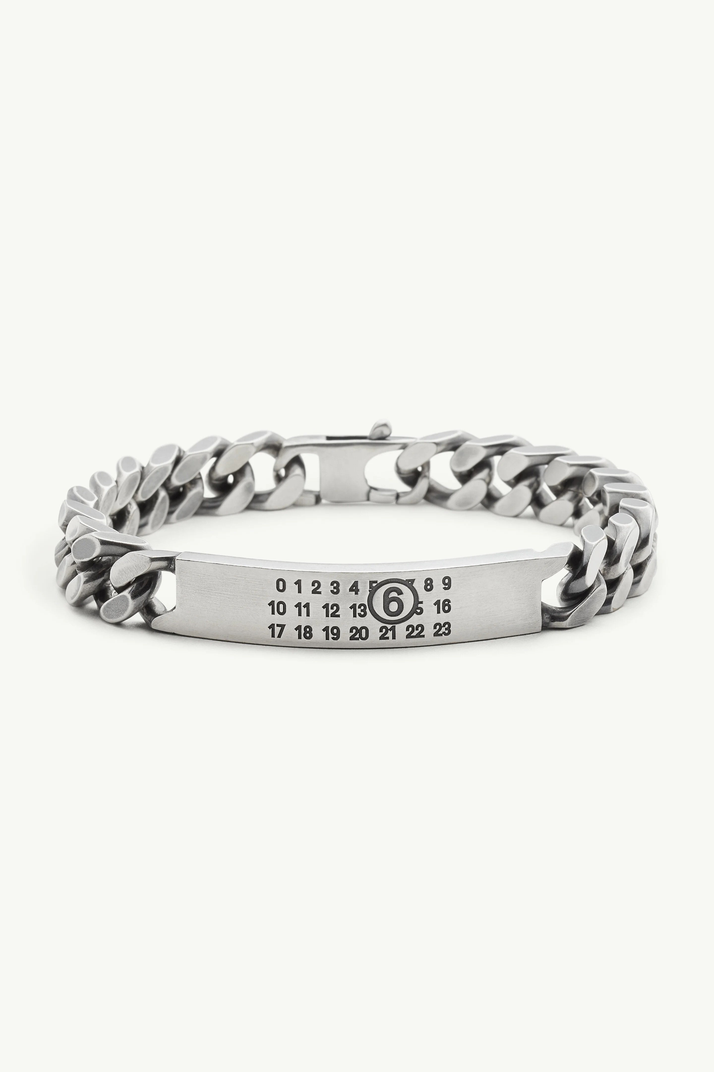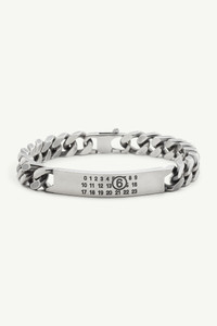 Chain bracelet in brass, inspired by classic Margiela chain jewellery designs. Displays an engraved numerical signature on a plate. Product Details Item ID SM6UY0049SV0235954 Composition: 100% brass One size Brass chain bracelet Engraved numbers on plate Matte brushed plate finish Polished chain links Push-lock clasp Engraved brand logo Made in Italy