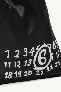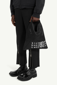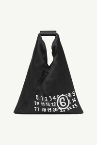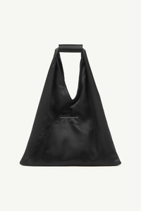 The iconic Japanese bag evolves with a fresh, durable update, showcasing the Maison's numeric leather cuff and handcrafted artwork. Versatile by design, its dynamic structure allows the silhouette to fluidly change shape, echoing the Japanese art of paper folding, origami. At the back, a discreet white stitch line subtly emphasizes MM6 the signature. Product Details Item ID S54WD0043P7184T8013 Body: 100% viscose-rayon Contrast: 100% calf leather Lining: 100% polyester Handbag in lining fabric MM6 numeric signature cuff Handwritten numbers logo at the front Two snap buttons at the edge to change the shape White stitch line at the back Button closure on leather detail Inside pocket with button closure Made in Italy Height: 42 cm/16,5 in Width: 2 cm/0,8 in Length: 34 cm/13,4 in Handle drop: 12 cm/4,7 in