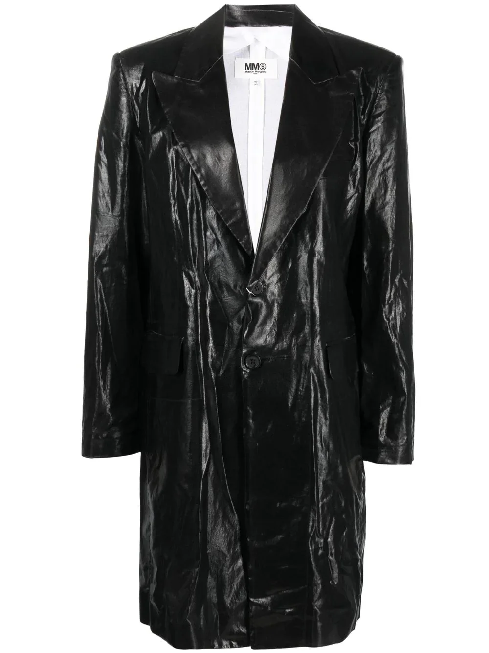 coated single-breasted coat Produced in a coated cotton fabrication, this MM6 Maison Margiela coat is crafted in a single-breasted style, exhibiting the brand's proclivity for sharp tailoring. Made in Italy Composition Cotton 100% SIZE & FIT Model measurements Height 5 ft 10 in(1.77 m) Bust/Chest 32.28 in(82 cm) Hips 35.03 in(89 cm) Waist 25.19 in(64 cm) FittingInformation This piece fits true to size. We recommend you get your regular size Cut for a loose fit Made with a mid-weight non-stretch fabric Washing instructions Dry Clean Only