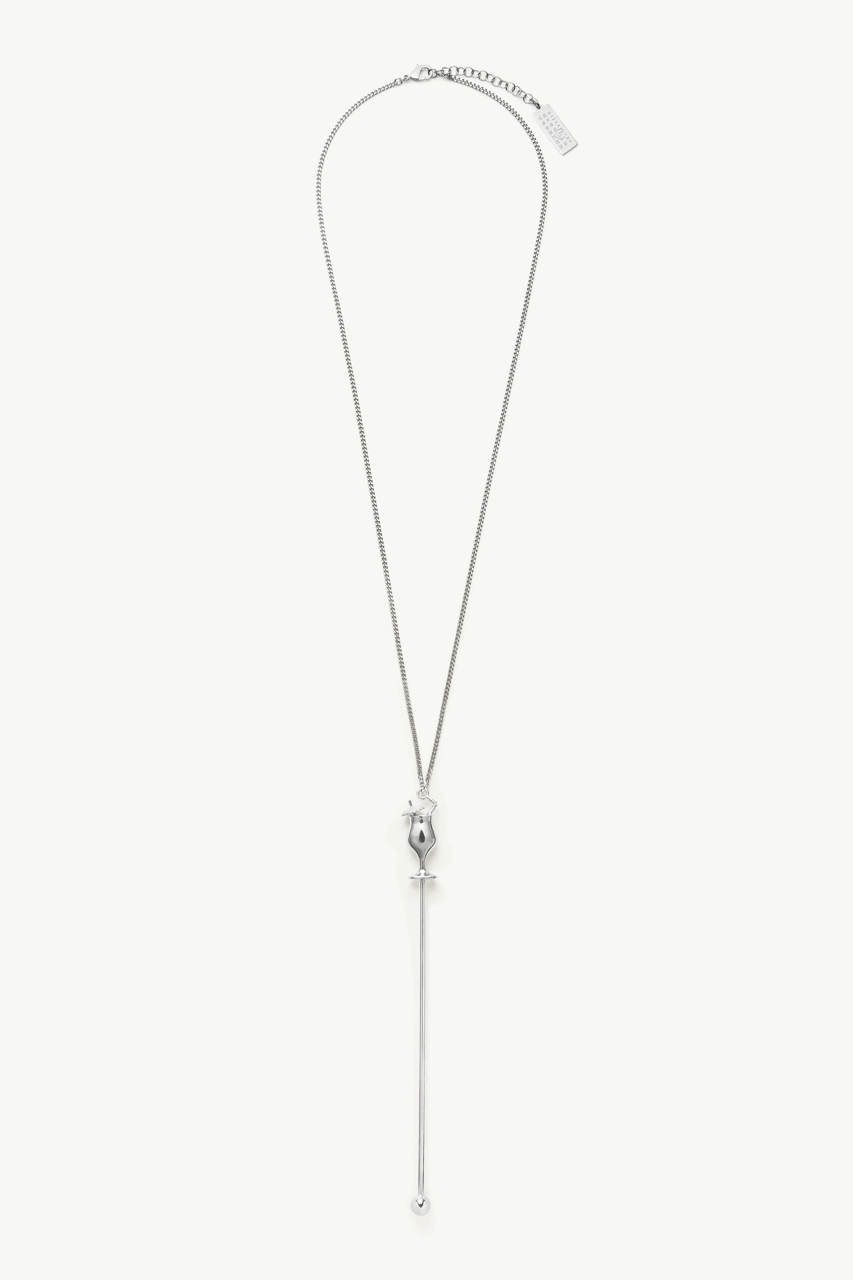 This pendant necklace draws directly from the form of a cocktail stick, reimagined as a sleek, elongated charm. Slender and unapologetically linear, it introduces a sense of playful irreverence. At the fastening, the Maison’s numeric artwork plaque quietly asserts its identity. Product Details Item ID SM7UU0126P9157951 Composition: 100% brass One size Brass necklace Pendant detail Engraved brand logo Avoid salt, chlorine water and aggressive liquid Made in Italy