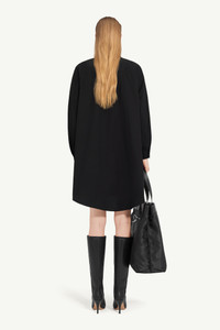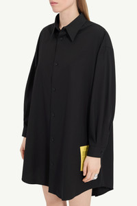 This oversized shirt dress distorts traditional tailoring with an asymmetric hem and relaxed proportions. The crisp cotton construction is punctuated by a bold yellow numeric artwork label, a graphic contrast to the monochrome palette. At the back, the white stitch line quietly reinforces MM6’s signature. Product Details Item ID S52CT0793M35480900 Primary fabric: 100% Cotton Midi-length, A-line silhouette dress Pointed collar neckline Front button closure, visible buttons Long sleeves, buttoned cuffs Dropped shoulder seams Curved hemline, longer at back Yellow rectangular patch at front White stitch line at the back Model is 180 cm tall and wears a size M.