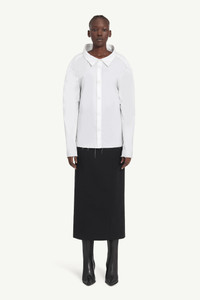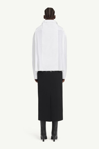 This cotton poplin shirt reworks traditional shirting with subtle subversion. Its crisp silhouette is interrupted by a full-length back panel, exposing the construction beneath. At the back, the MM6 white stitch line highlights its identity. Product Details Item ID S62DT0049M35256100 Primary fabric: 100% cotton Pointed collar Button front fastening Long sleeves with button cuffs Straight hem with raw-edge finish Back panel insert White stitch line at the back Model is 179 cm tall and wears a size 40.
