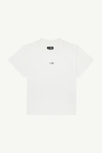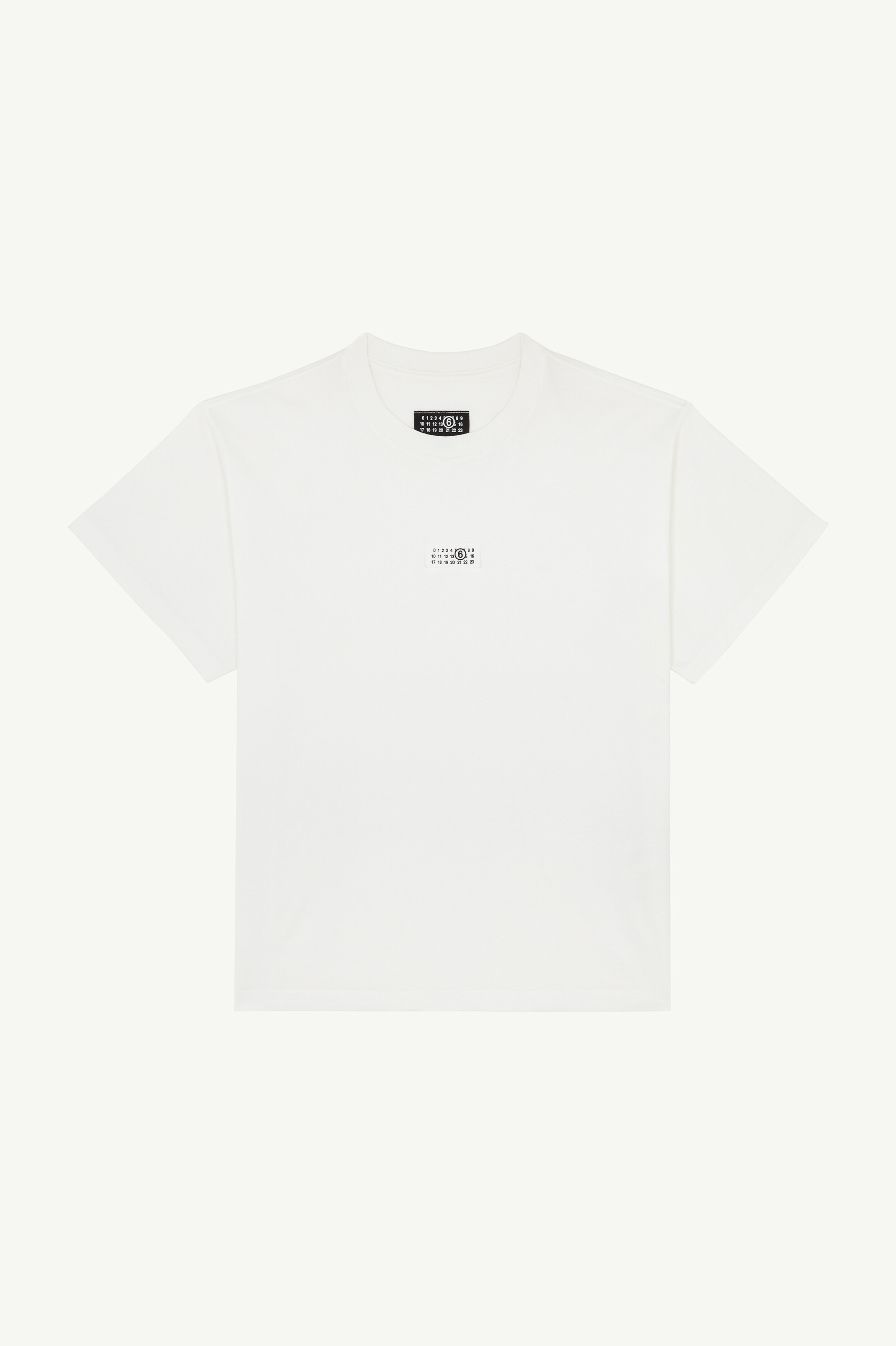 T-shirt expertly shaped from soft-to-the-touch cotton jersey. The t-shirt is shaped to a crew-neck and features the brand's numeric signature at the front. MM6's discreet yet distinct signature, a horizontal line of white stitches, is found on the back of the garment. Product Details Item ID SH0GC0032S24312101 Primary fabric: 100% Cotton Boxy T-shirt, minimal detail, cotton Crew neckline Short sleeves, straight cut Straight hemline design Center chest patch with numbers Visible back yoke stitching White stitch line at the back