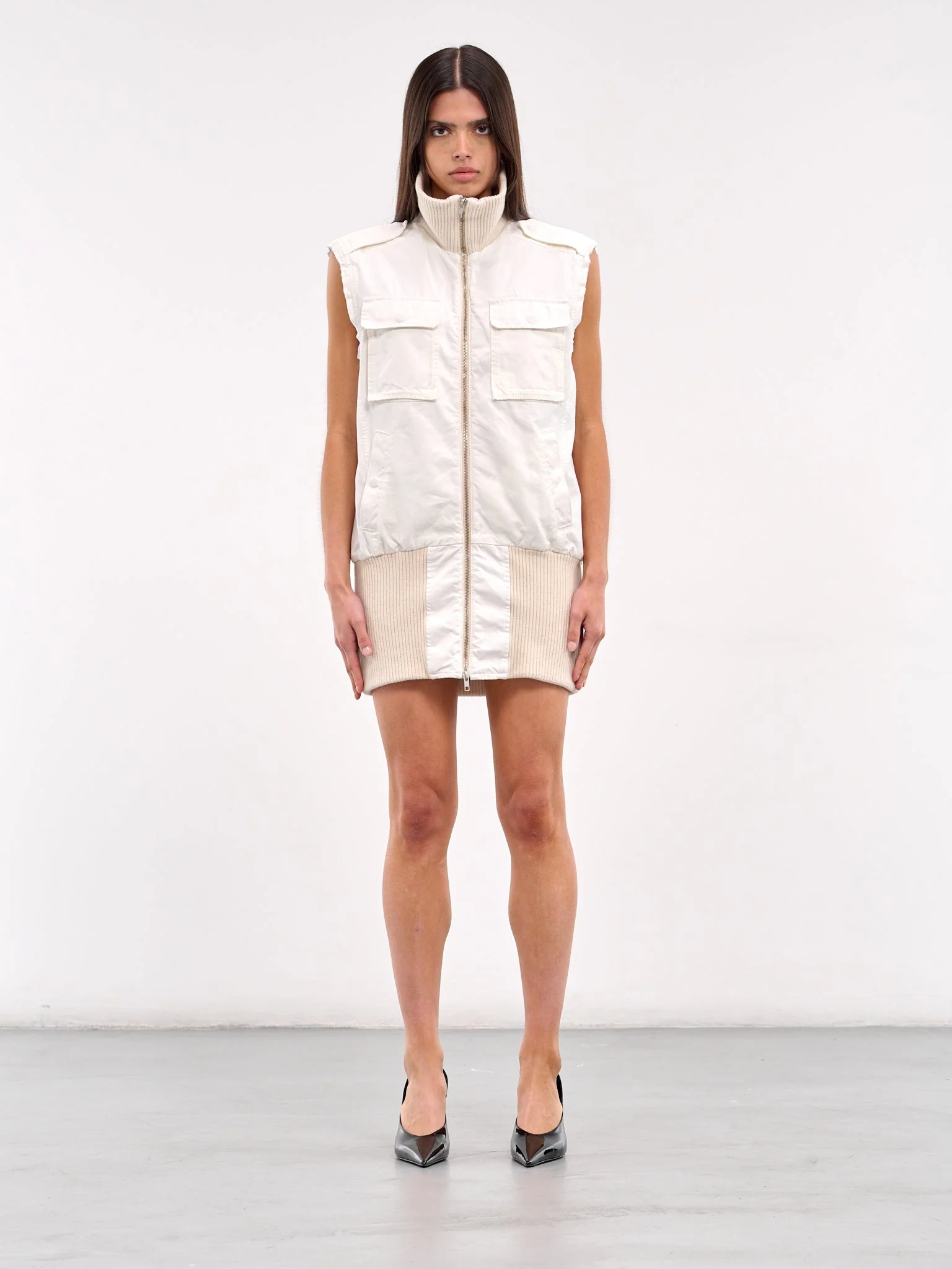 MM6 MAISON MARGIELA vest in white, paneled cotton construction, ribbed stand collar, front exposed two-way zip closure, shoulder epaulets, sleeveless, armscyes, chest buttoned flap pockets, back pleating, elongated rib-knit hem, straight hemline, mini-length, slim fit. Made in Italy 100% Cotton Italian Sizing Model is 5'8" wearing size 38. Bust: 32.5" Waist: 24" Hips: 34"