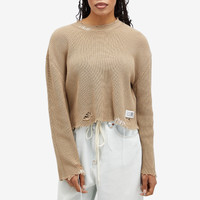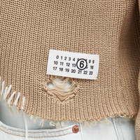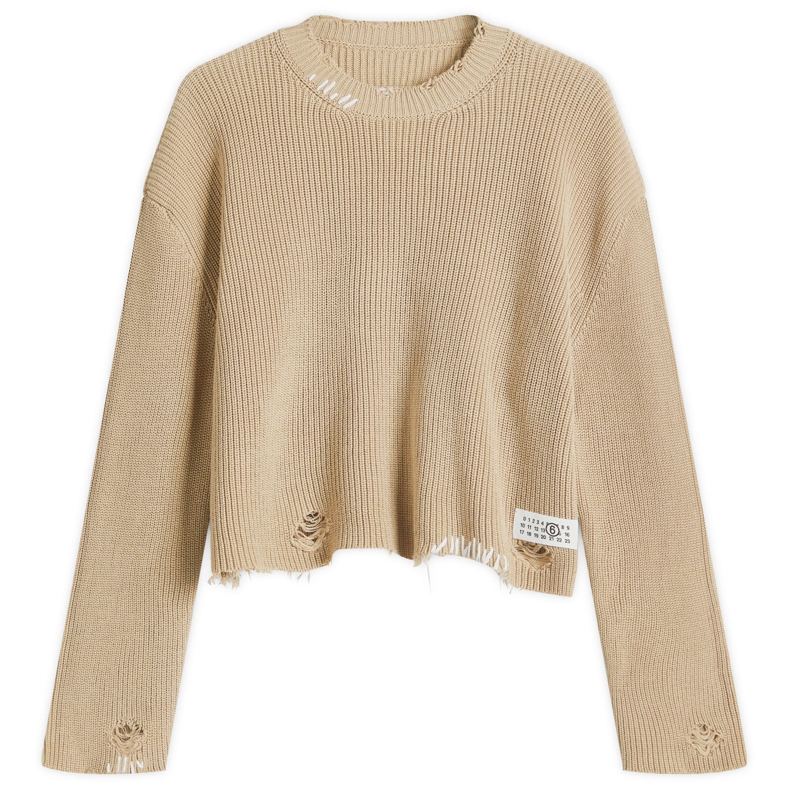 Everyday style reimagined: MM6 designs fuse unique fabric treatments with fresh, forward-thinking silhouettes. This cropped knitted crewneck showcases distressed and deconstructed details, finished with white stitch details dotted around the seams. Just above the hem, you’ll find a logo patch displaying the brand’s iconic numbers motif. - 100% Cotton - Crewneck - Distressed Details - Woven Branded Patch - Made in Italy