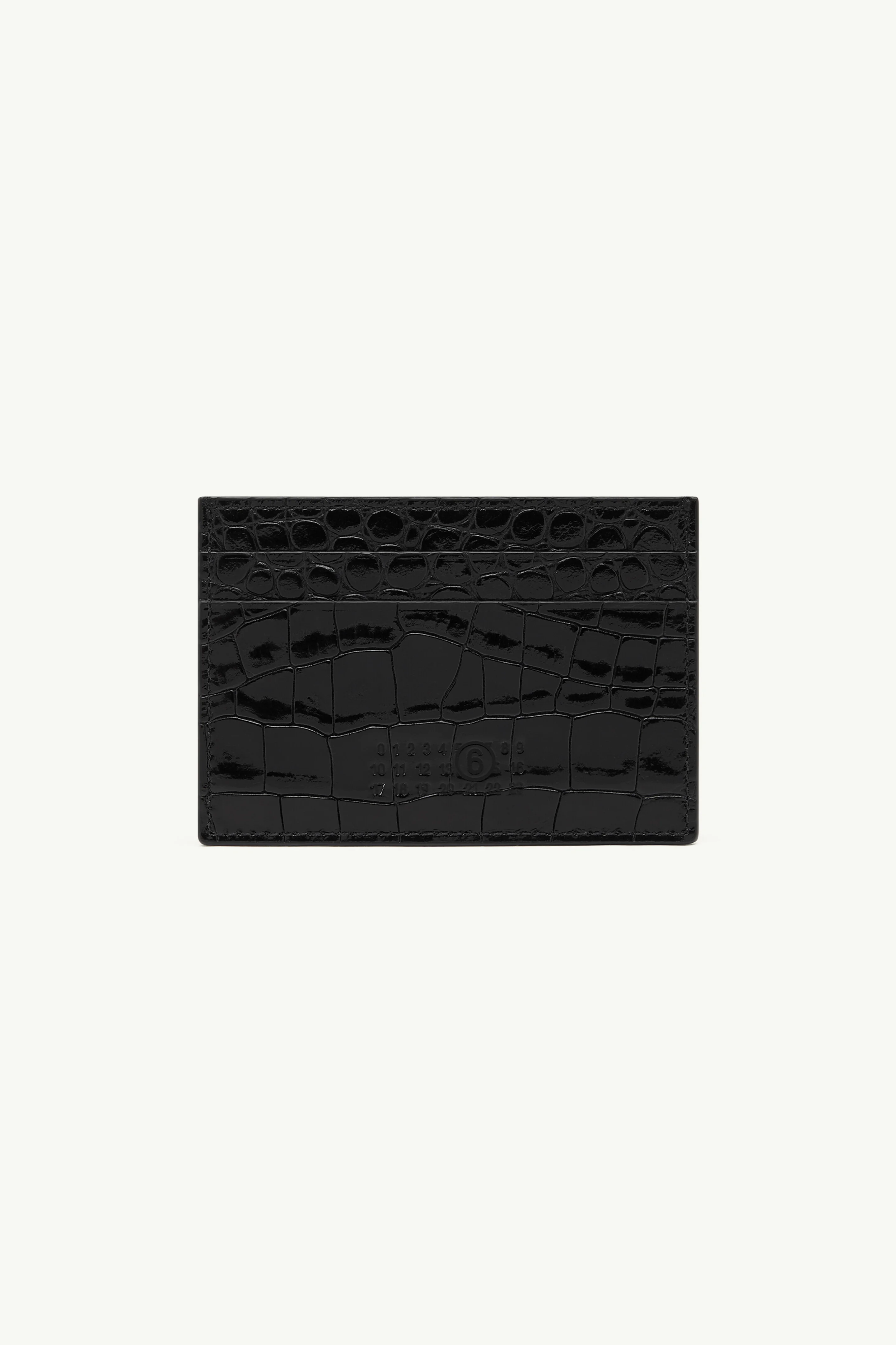 A streamlined shape in embossed faux leather, this card holder brings the Maison's deconstructive ethos to everyday functionality. The textured finish is subtly contrasted by the MM6 numeric artwork and signature white stitch line – quiet markers of its identity. Product Details Item ID SA6UI0035P8650T8013 Primary material: 100% Croc-print leather Secondary material: 100% Cotton Metallic hardware Card holder in crocodile-embossed faux leather Two front card slots Two back card slots Numeric artwork at the front White stitch line at the back Made in Italy