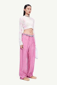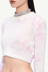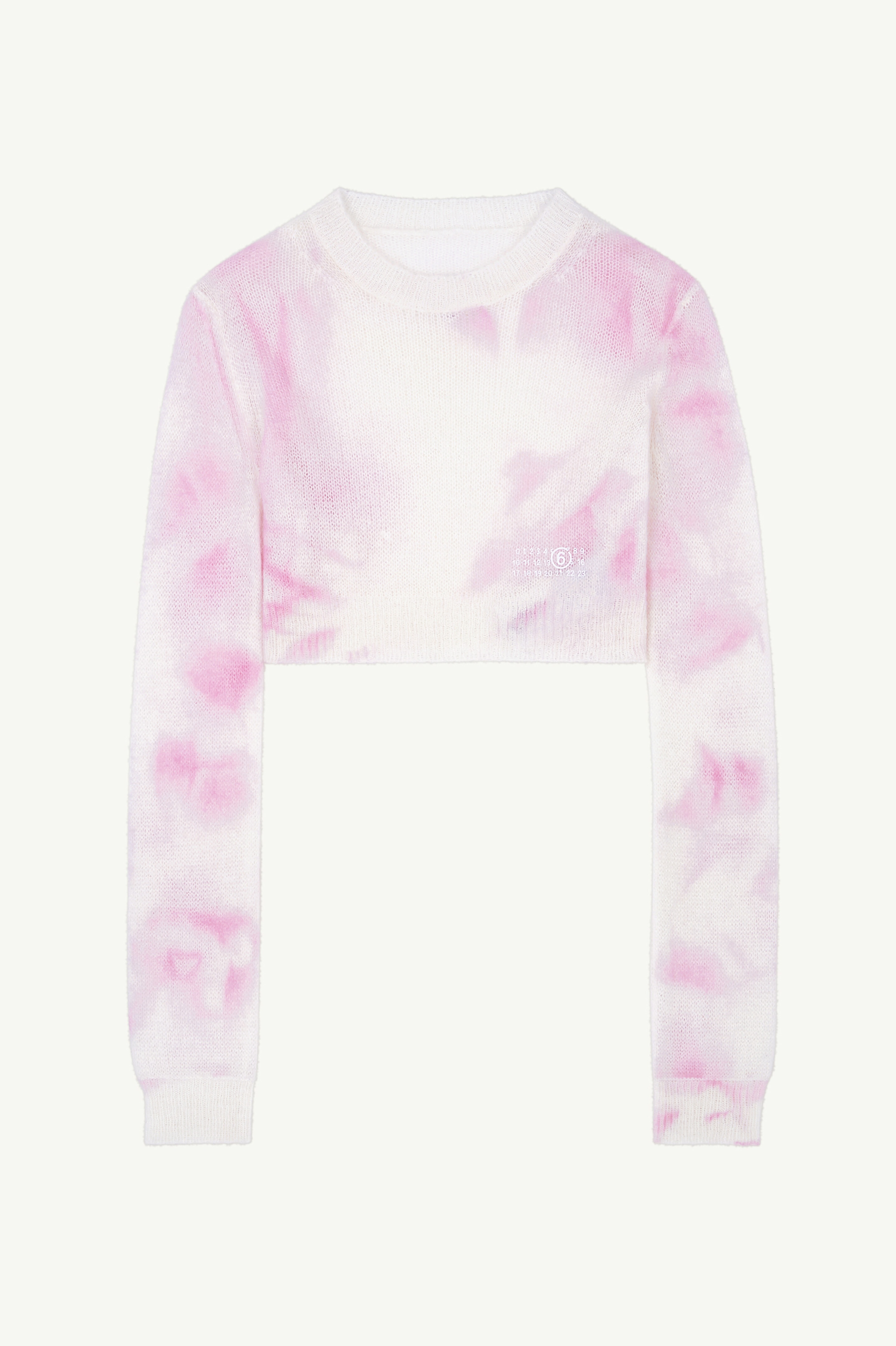 Long-sleeve jumper crafted in loose soft knit with sprayed colour effect, showcasing a print from the Margiela archives. The snug and cropped style highlights the silhouette in motion, a central theme of the collection. A numerical logo above the hemline and a white label at the back complete the design. Gauge 7. Model is 179cm tall and wears a size S.