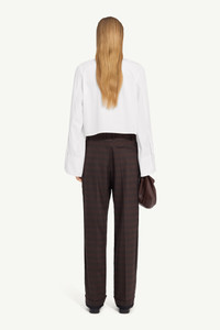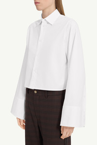 This conceptual white shirt challenges symmetry with its dynamic, versatile design. Wear in its polished, traditional form or deconstructed with an oversized billowing sleeve and unexpected draped detailing. Finished with the MM6 white stitch line, it offers an experimental approach to a wardrobe staple. Product Details Item ID S52DT0044M35480100 Primary fabric: 100% Cotton Cropped boxy silhouette shirt Classic shirt collar Concealed button placket Top button detail Long sleeves with wide cuffs Three cuff buttons Straight hemline Shoulder button detailing White stitch line at the back Model is 180 cm tall and wears a size 42.