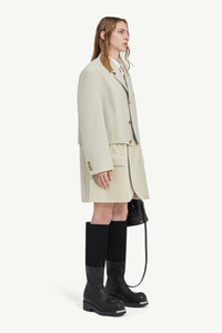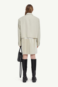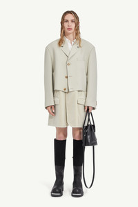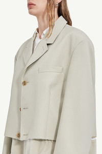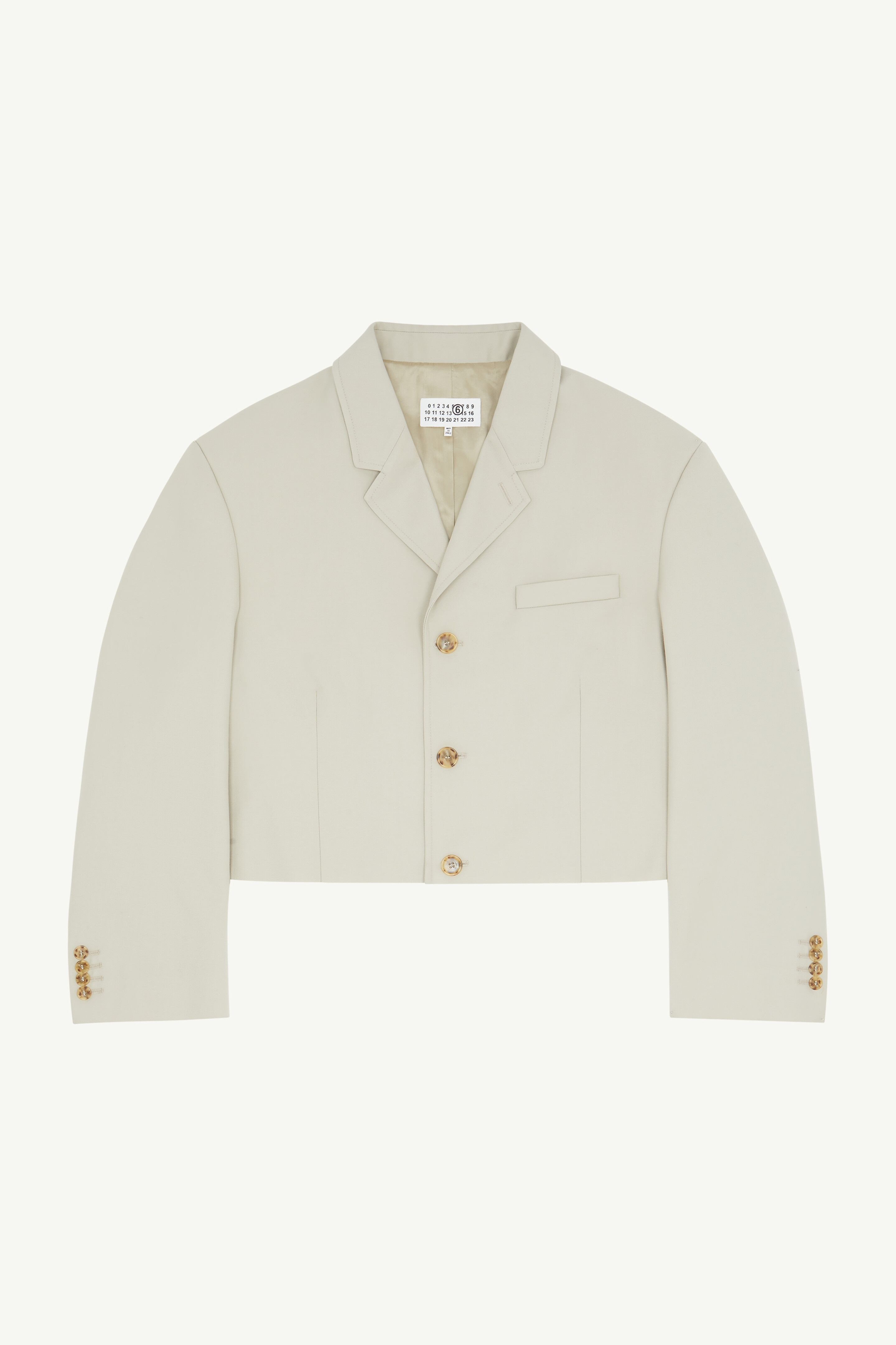 Cropped single-breasted suit jacket in tailoring wool with notch lapels and padded shoulders detailing. The loose thread details on the hemline are part of the Maison’s desconstructed design ethos. MM6’s discreet yet distinct signature, a horizontal line of white stitches, is found on the back of the garment. Product Details Item ID S62BN0083S78357212 Composition: 55% polyester, 45% wool Lining: 100% viscose-rayon Suit jacket in tailoring wool Single-breasted closure Notch lapel Padded shoulders Welt pocket Buttoned cuffs Raw hem White stitch line at the back Oversized fit Made in Italy