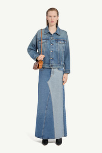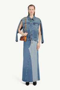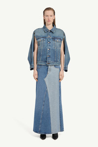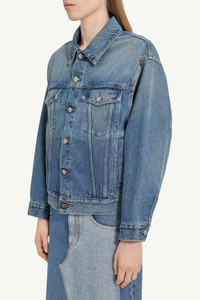 An archetypal denim jacket, distilled and subtly reworked. Structured shoulders and precise seaming create a sharp silhouette, softened by an aged wash that suggests a lived-in familiarity. At the back, the white stitch line serves as the Maison’s signature. Product Details Item ID S52AM0308M30018965 Primary fabric: 100% Cotton Pocket lining: 65% Polyester, 35% Cotton Oversized denim jacket with boxy silhouette Pointed collar, button-front fastening Metal buttons, two chest flap pockets Flap pockets with button closures Two vertical welt pockets Long sleeves with buttoned cuffs Visible seams, panelled construction Adjustable button tab at the back hem Distinctive contrast topstitching Slight fade detailing on denim Removable sleeves for versatile styling White stitch line at the back Made in Italy Model is 180 cm tall and wears a size 42.