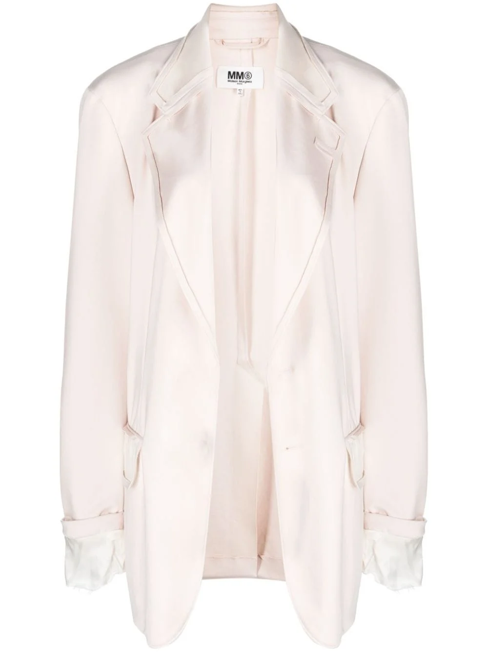 long-sleeve single-breasted blazer Highlights - Blush beige - Stretch-design - Exposed-seam detailing - Peak lapels - Front button fastening - Long sleeves - Front flap pockets - Full lining Made in Italy Composition Outer: Polyester 70%, Elastane 30% Lining: Viscose 100% SIZE & FIT Model measurements Height 5 ft 10 in(1.78 m) Bust/Chest 30.7 in(78 cm) Hips 34.64 in(88 cm) Waist 23.22 in(59 cm) FittingInformation Designed for a boxy fit, intended for a loose fit throughout The internal shoulder pads offer a structured shape Made from a midweight stretch fabric, this piece offers elasticity and flexibility when worn This piece fits true to size – take your usual size Washing instructions Dry Clean Only