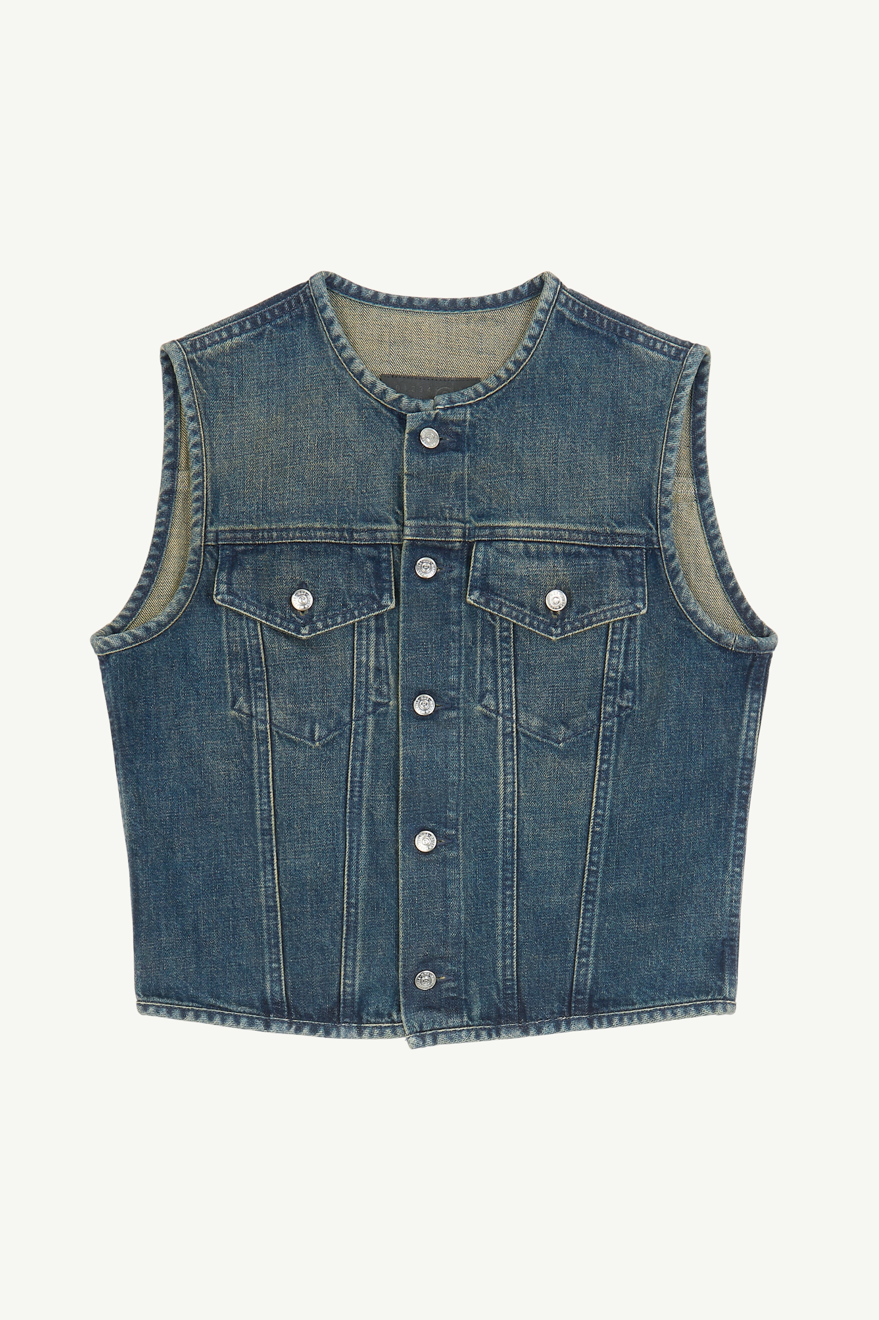Modelled on vintage denim jackets, MM6’s gilet is made from faded-washed cotton denim and cut to a cropped fit. The style features a crew neck, button closure and button flap pockets. The brand’s discreet yet distinct signature, a horizontal line of white stitches, is found on the back of the garment. Product Details Item ID S52FB0087S30888961 Composition: 100% cotton Denim waistcoat Crewneck Button closure Buttoned flap pockets White stitch line at the back Slim fit Made in Italy Model is 180 cm tall and wears a size 42.