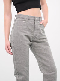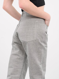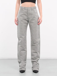 MM6 MAISON MARGIELA pants in grey, paneled denim construction, belt loops, front button & concealed zip fly, back signature stitch detailing, inset pockets, coin pocket, back patch pockets, straight leg, loose fit. Made in Italy 100% Cotton Standard Sizing Model is 5'9" wearing size 26. Bust: 32" Waist: 24" Hips: 34"
