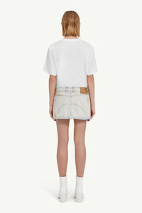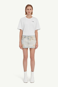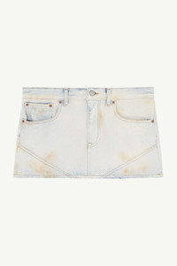 This unconventional denim skirt reinterprets traditional design with its distressed colouring and statement mini silhouette. Its rebellious style is further defined by the MM6 white stitch line and numeric signature at the back, capturing a bold narrative of flux and self-expression. Product Details Item ID S52MC0011M30018982 Primary fabric: 100% cotton Pocket lining: 65% polyester, 35% cotton Blue denim 5-pocket mini skirt Light wash Zip and button closure White stitch line and MM6 numeric signature jacron label at the back Made in Italy