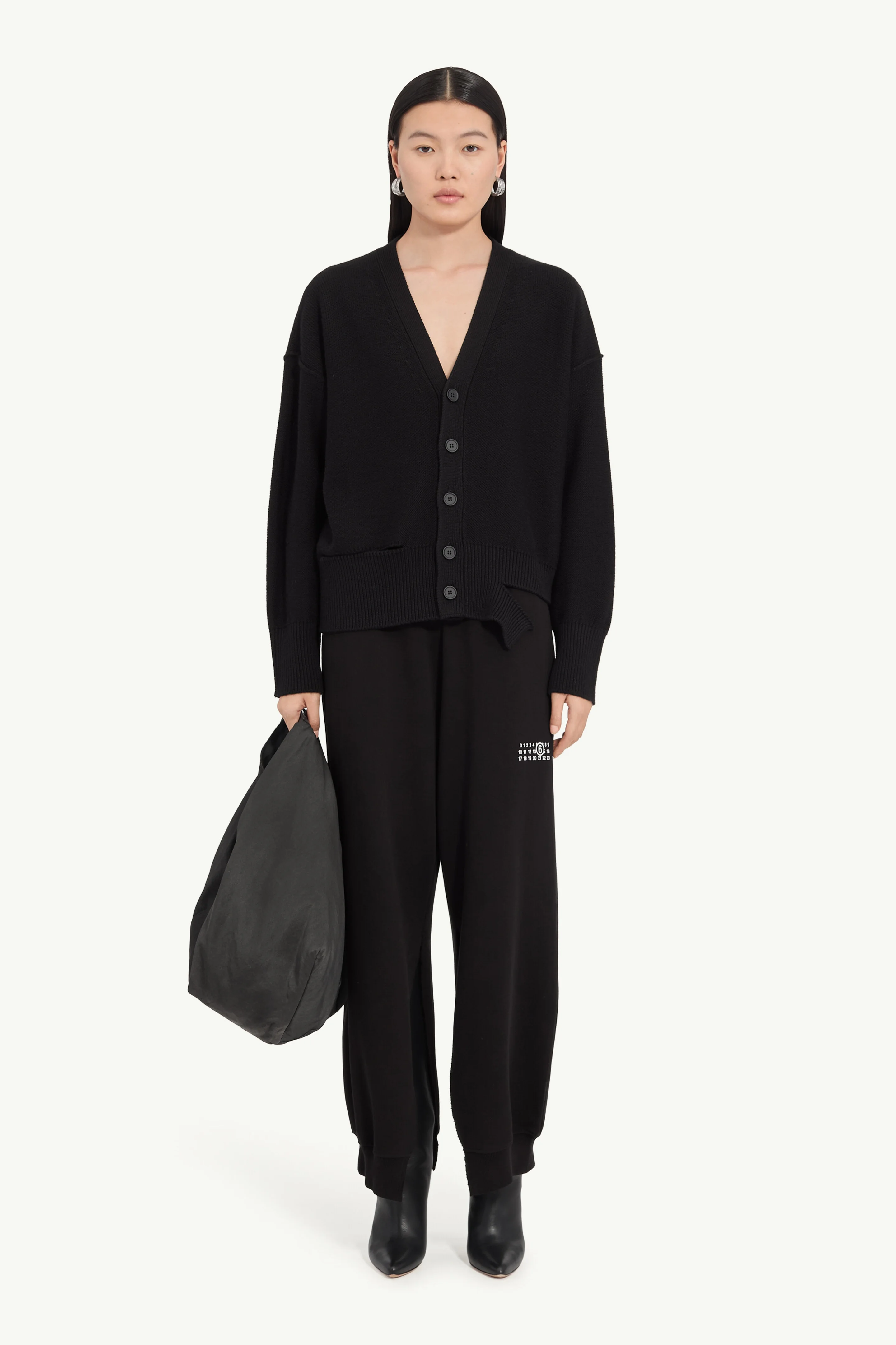 This cardigan reworks a wardrobe staple with MM6’s signature offbeat tailoring. Unexpected distressing at the hem suggests a narrative of wear, while dropped shoulders and a deep V-neckline introduce a sense of fluidity. Finished with tonal buttons and the Maison’s white stitch line, it strikes the perfect balance between undone elegance and structured ease. Product Details Item ID S52HP0026M13044900 Primary Fabric: 50% Virgin Wool 50% Acrylic V-neck cardigan in wool blend Button front closure Dropped shoulders Distressed detailing at the hem Ribbed trims White stitch line at the back Made in Italy Model is 179 cm tall and wears a size M.