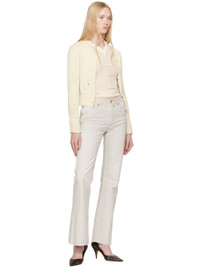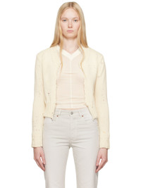 Knit cotton-blend cardigan. Distressing and paint splatter throughout. · Rib-knit V-neck, hem, and cuffs · Raw edges at open front · White stitching at back collar Each item is unique. Please note that splatter and finishings may vary. Supplier color: Cream 75% cotton, 20% polyester, 5% other fibers. Made in Italy 251188F095014