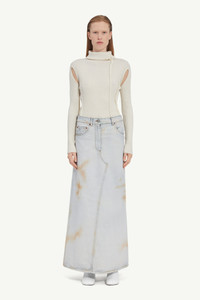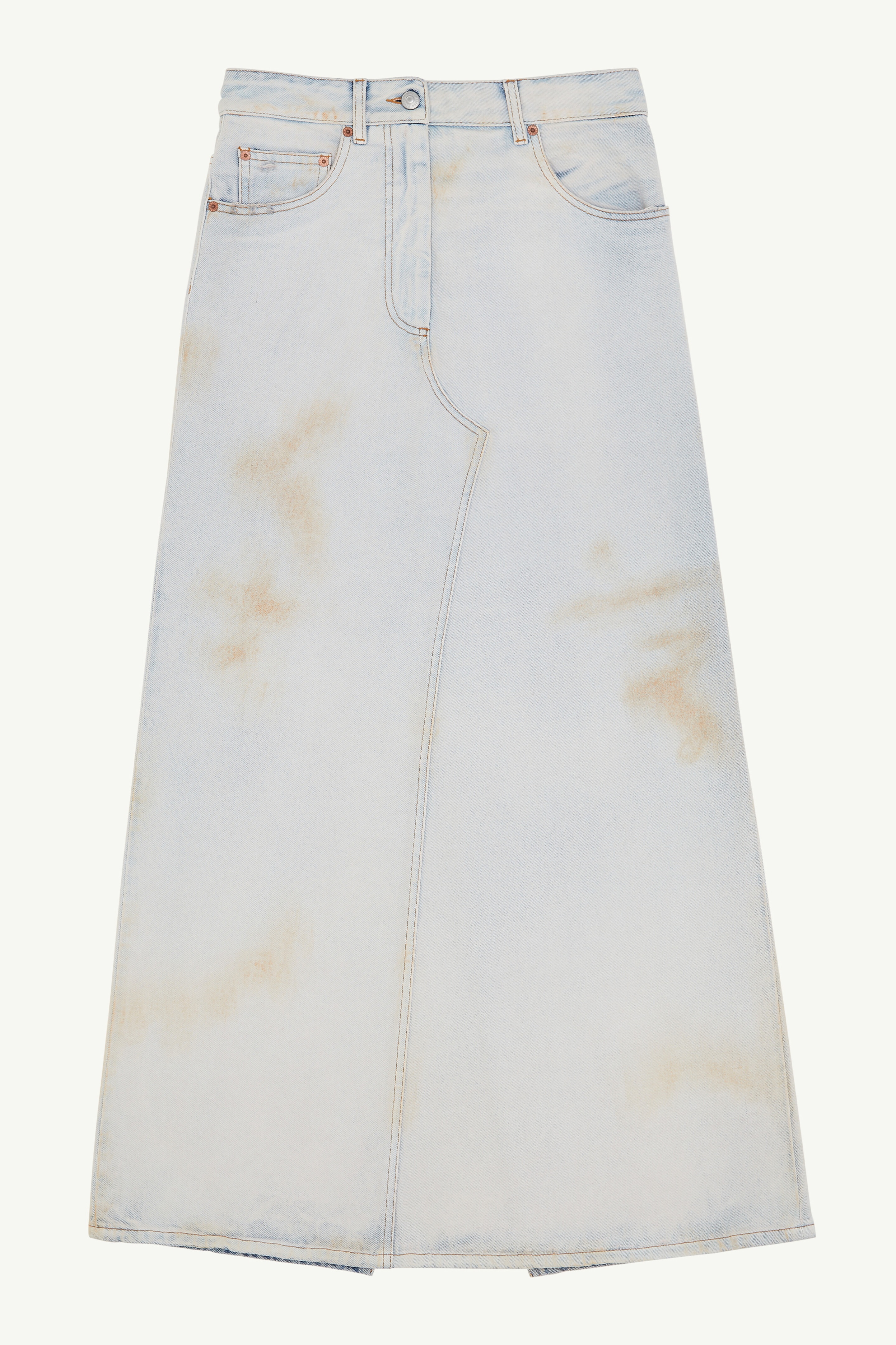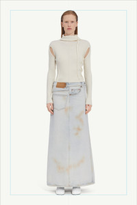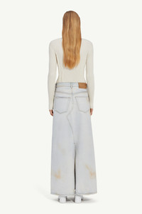 This maxi denim skirt exemplifies MM6's innovative 90° twist with its unexpected seam placements and creatively distressed finish. The elongated, fluid shape defies traditional proportions, adding an edge to its classic design. At the back, the distinctive white stitch line and numeric label reinforce the Maison’s identity. Product Details Item ID S52MI0016M30018982 Composition: 100% cotton Pocket lining: 65% polyester, 35% cotton Blue denim 5-pocket long skirt Light wash Zip and button closure White stitch line and MM6 numeric signature jacron label at the back Made in Italy